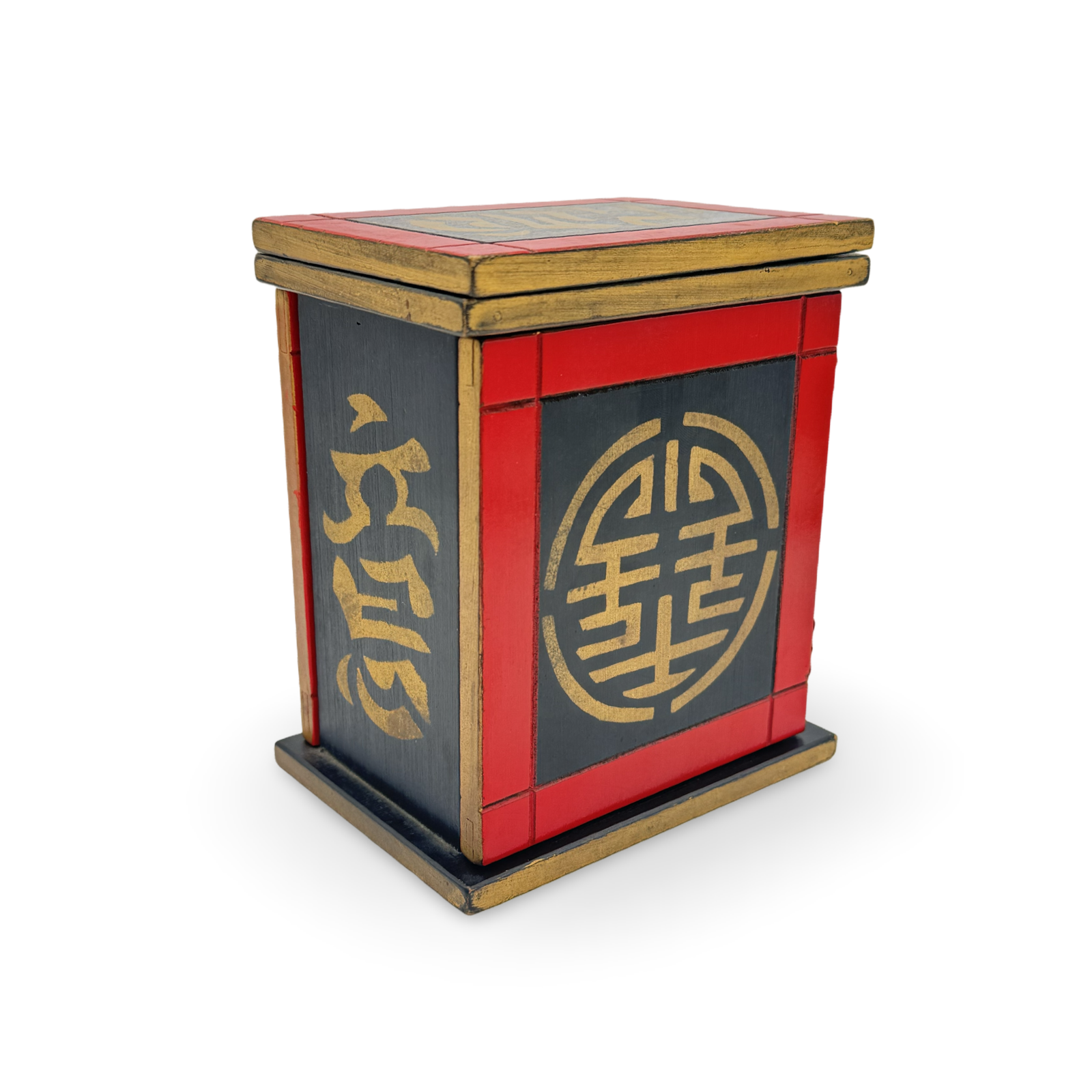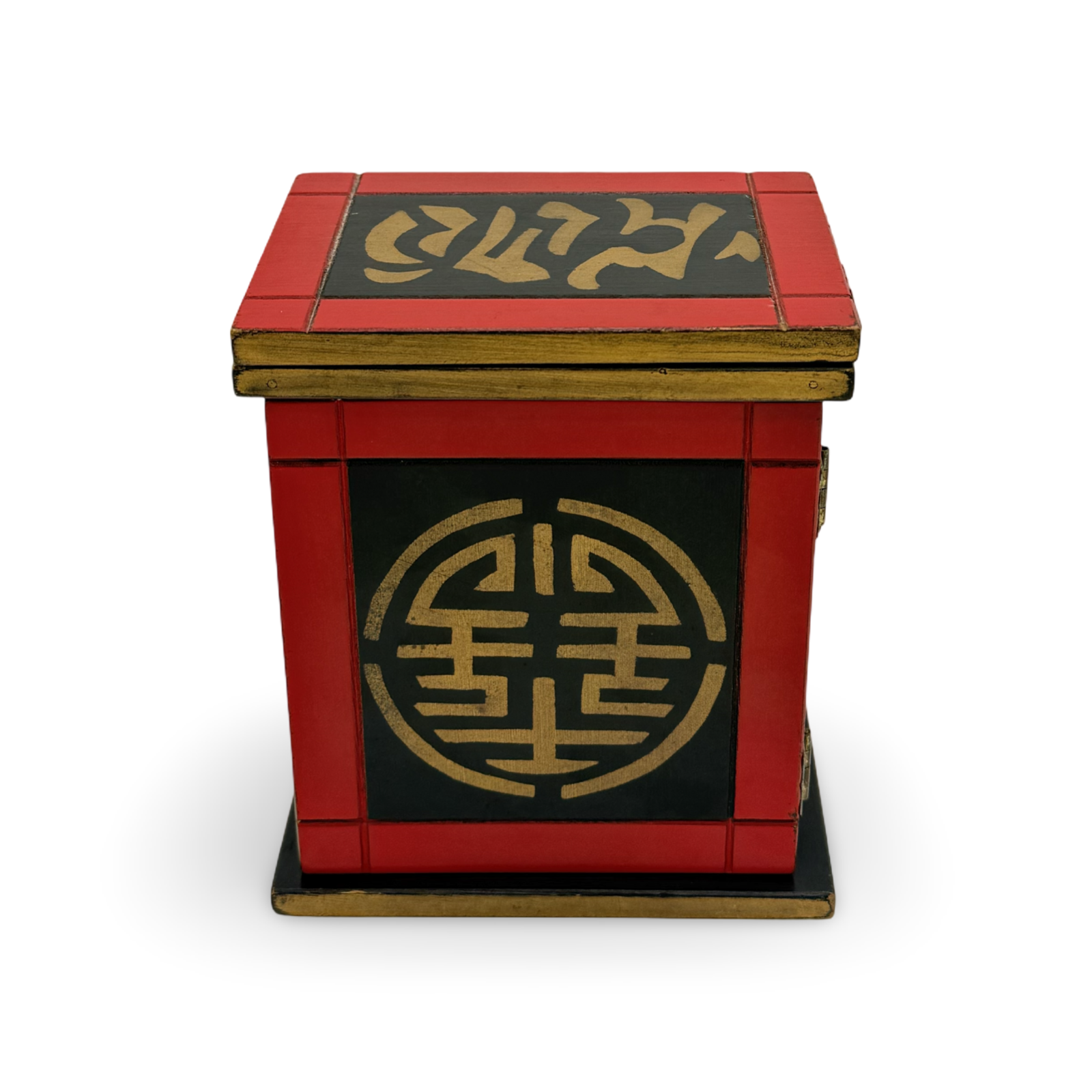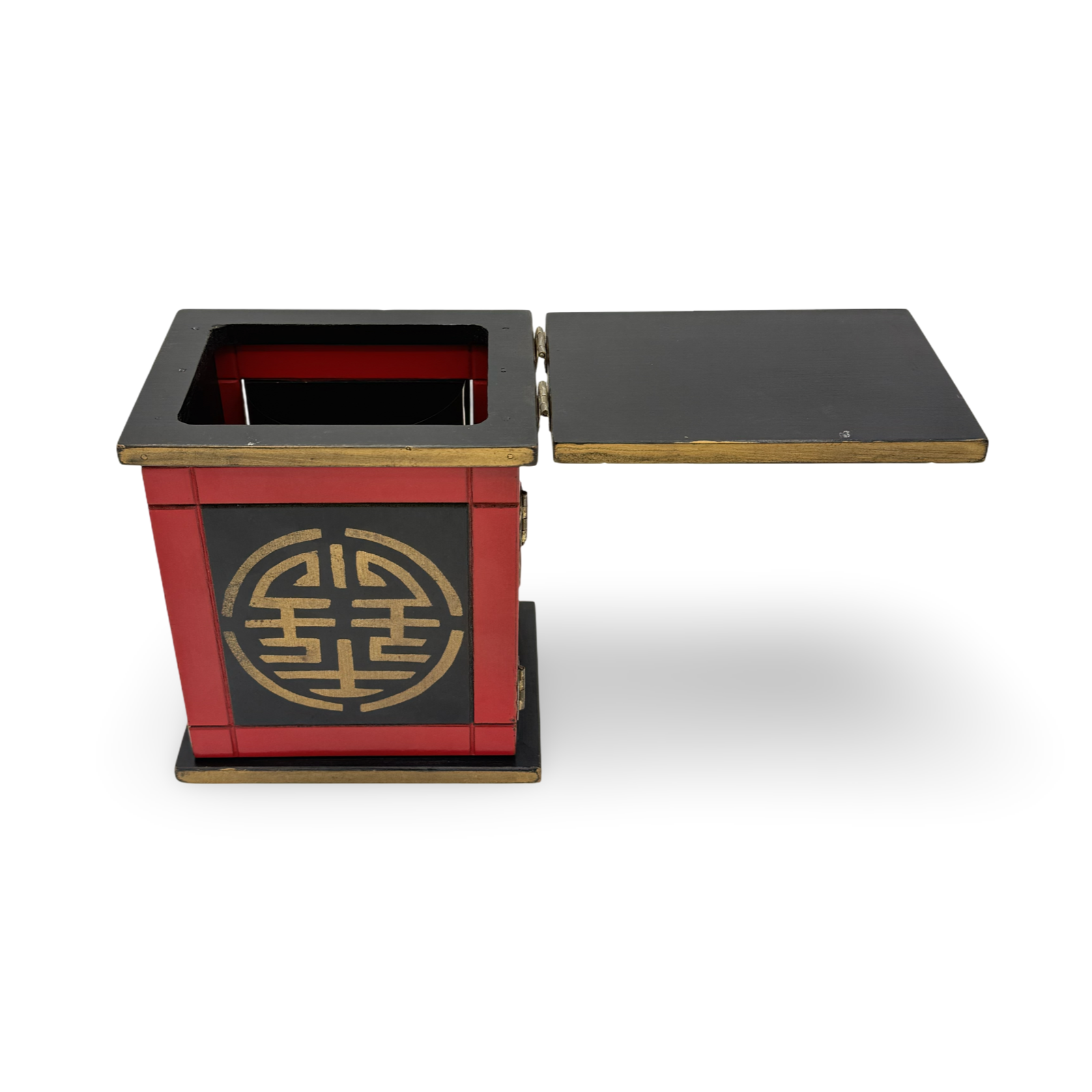 A compact red cabinet decorated with black and gold designs. Though shown empty, the box instantly produces a surprising quantity of silks at the magician’s command. Expertly crafted by Owen. Measures 6 x 4 x 5.25 inches. Very good condition.