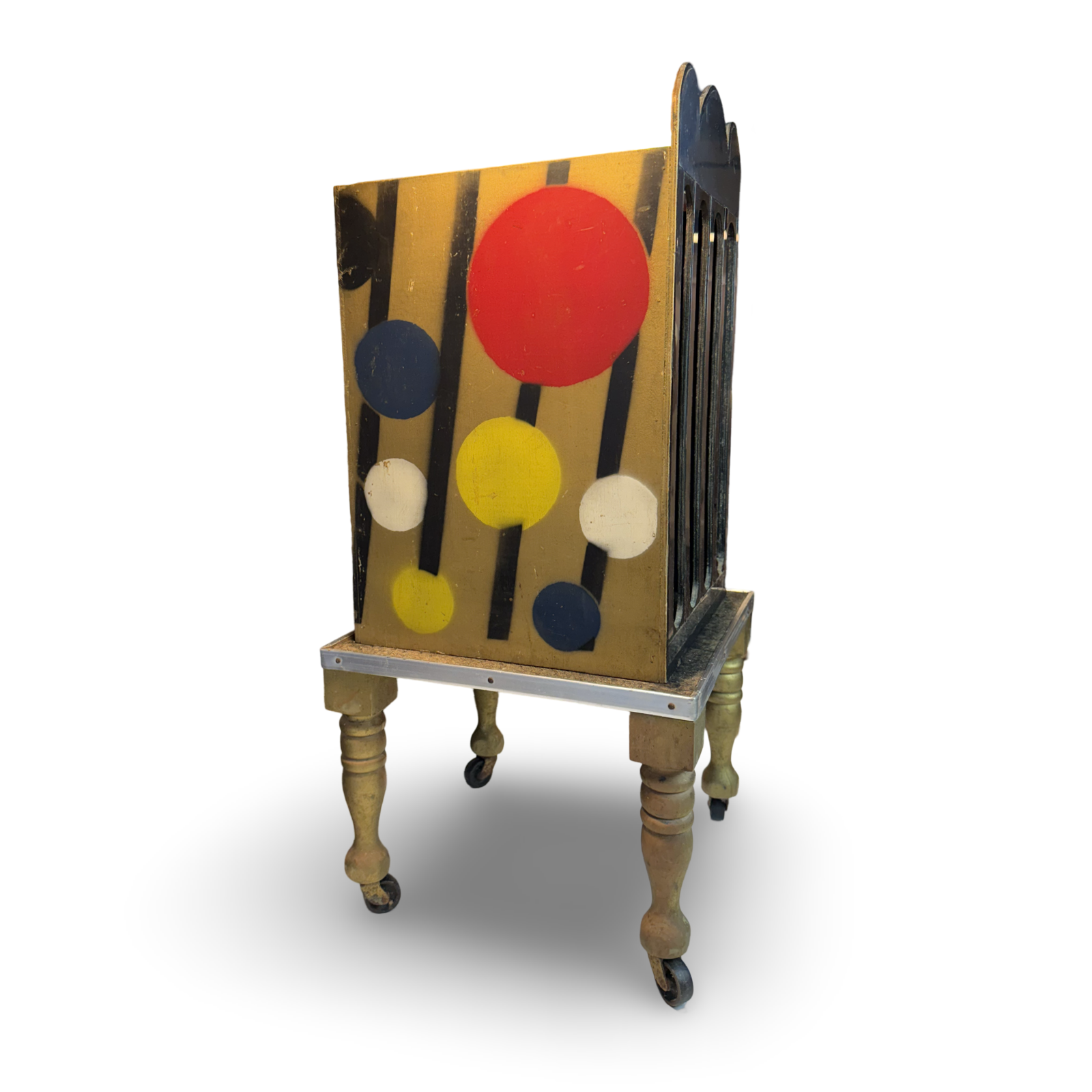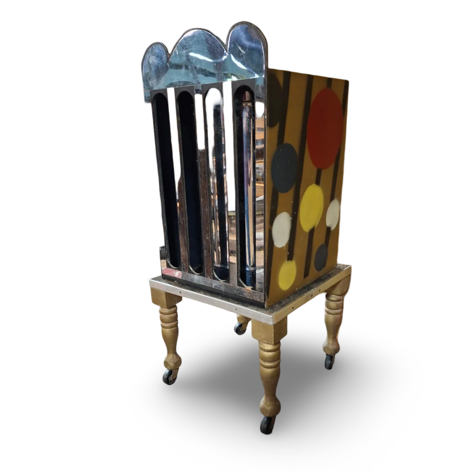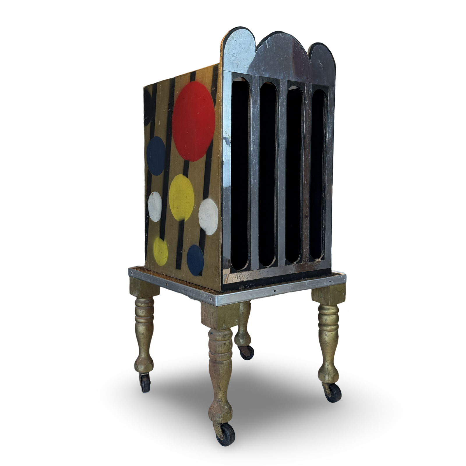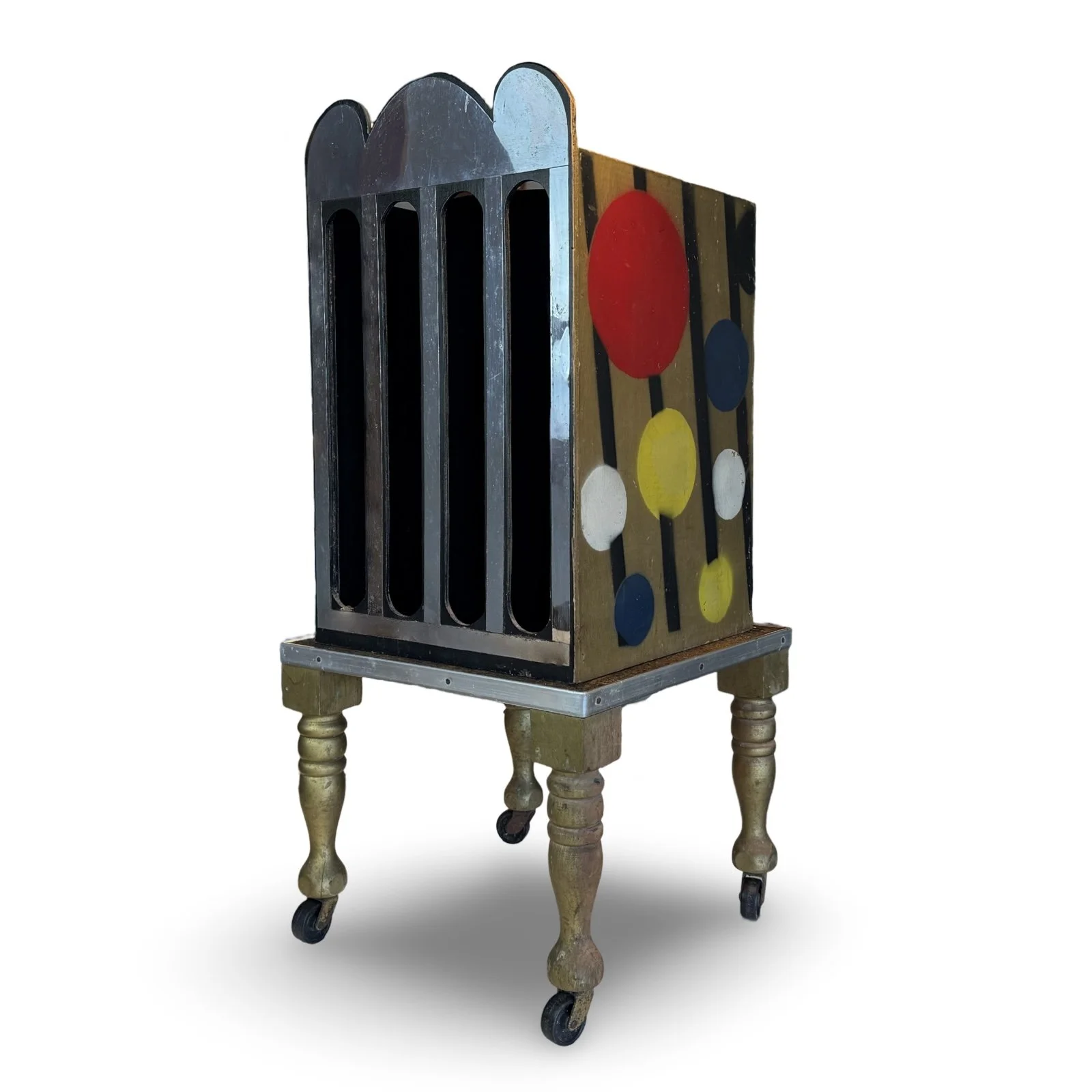 A rabbit placed in the cabinet is “wrung” flat as it emerges between cloth rollers, then vanished entirely—only to reappear alive if desired. Finished in black lacquer with gold trim. Complete with flat rabbit and photocopied instructions. Very good condition.
